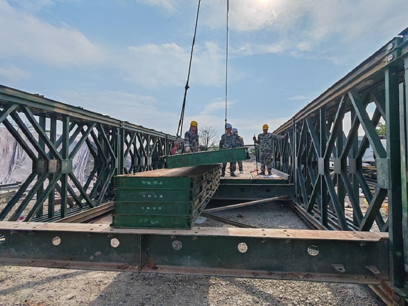 ZB-200型裝配式貝雷梁鋼便橋跨徑可達(dá)30米,荷載55噸,采用單銷(xiāo)連接桁架結(jié)構(gòu)主梁的下承式橋梁設(shè)計(jì),是一種可分解的、能快速架設(shè)的制式橋梁,具有結(jié)構(gòu)簡(jiǎn)單、運(yùn)輸方便、載重量大、互換性好、適應(yīng)性強(qiáng)的特點(diǎn),被廣泛應(yīng)用于應(yīng)急交通保障。